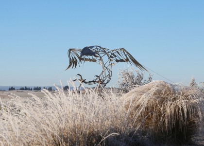 A prominent feature of the wet land walk is the Haast Eagle (Harpagornis moorei) Sculture, a 750kg stainless steel sculpture created by Arrowtown sculptor Mark Hill. The Haast’s eagle is understood to have lived in the South Island, including near Macraes. It became extinct more than 500 years ago. The bird is known to have attacked and eaten moa. It weighed up to 15kg and had a wingspan of up to 3m. The sculpture is 7m wide and has a wingspan of 12m.